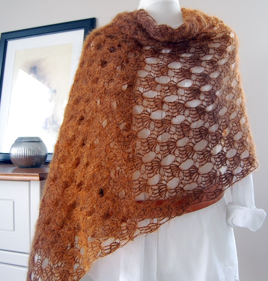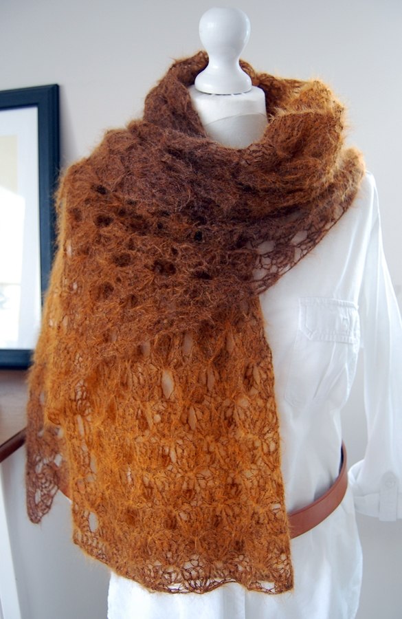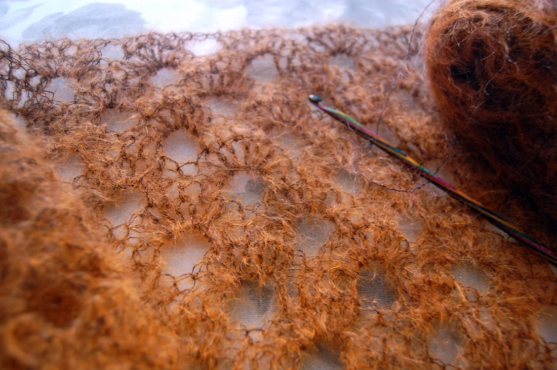 2025-10-15 15:56:00Kasztanowy szal, to prosty szydełkowy wzór na moherowej włóczce.