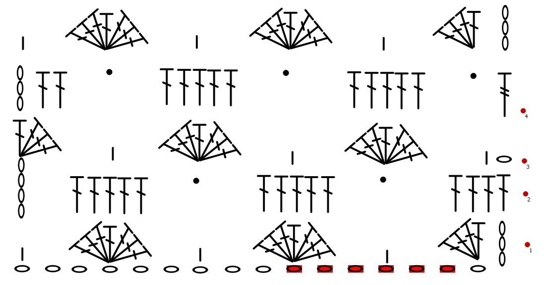 3 o. ł; 2 słupki; 1 o. nad o. ścisłym poprzedniego rz.; 5 słupków w poprzednim wachlarzu; kończymy 1 podwójnym słupkiem.