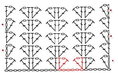 4 o. ł.; w 1 oczku - 1 słupek; ominąć 4 o. ł; w 5 oczku - 1 słupek, 1 o. ł., 1 słupek; w 6 oczku - 1 słupek, 1 o. ł., 1 słupek; ominąć 4 o.ł. – powtarzać oczka zaznaczone we wzorze na czerwono kończymy – 1 słupek, 1 o. ł., 1 słupek.